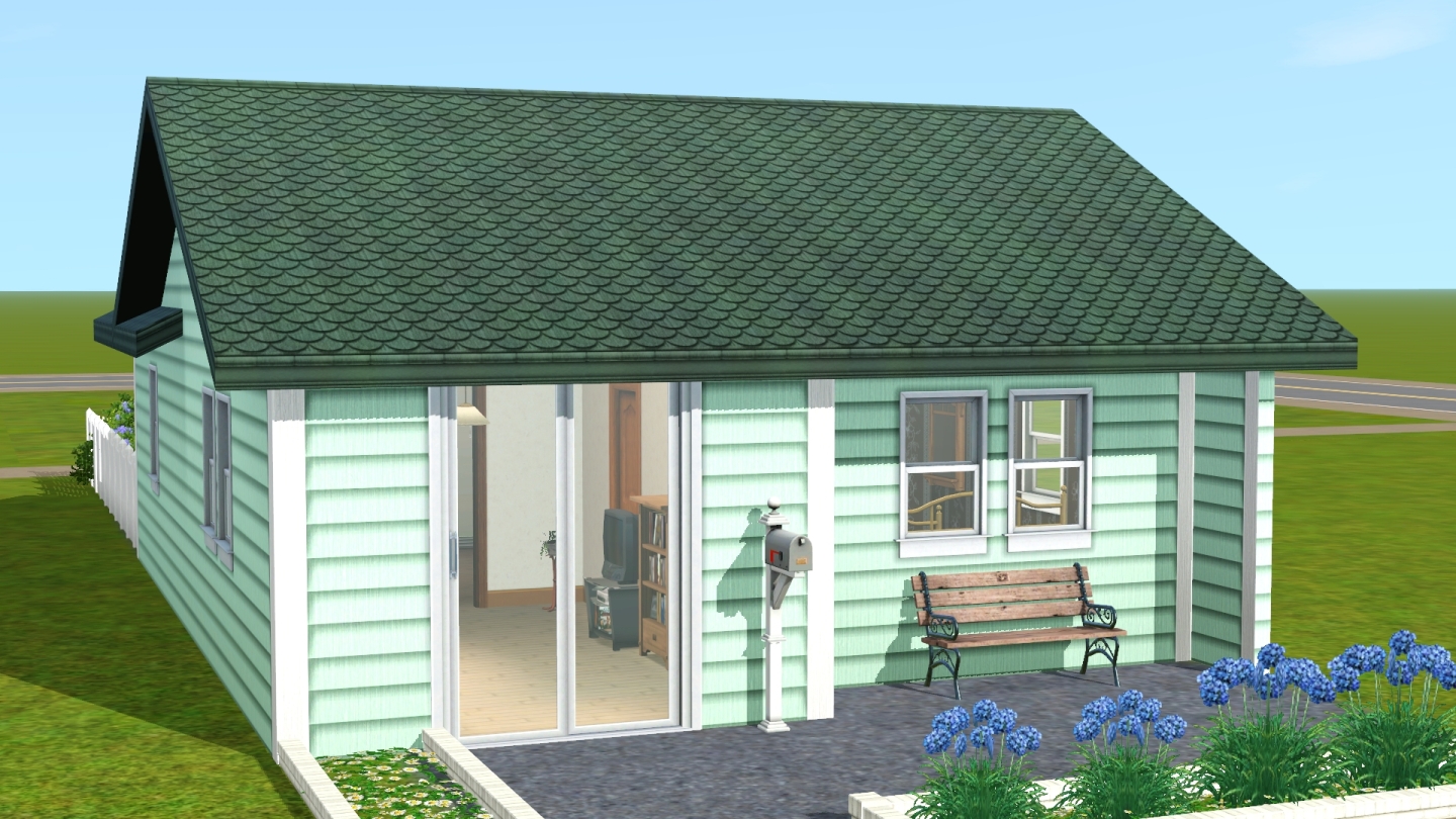 Washbourne is a starter house made with base game objects only, and furnished for a couple of Sims on a narrow lot. The house has a living room, kitchen/dining room, bathroom, and a double bedroom with an ensuite. There is a patio around the front and back, with a few extras on the lot.