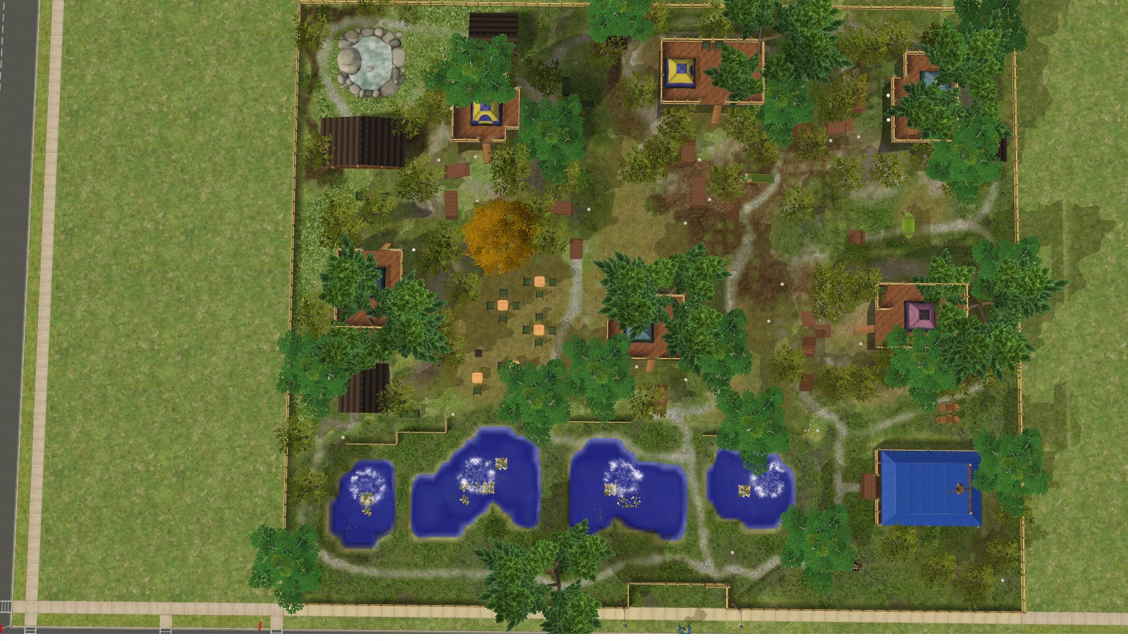 As there are no roaring lions in the game, I added some fun things for Sims to do, so the camping ground offers (beware of the hippo's, please!) fishing, a hot spring, a sauna and a chess table. Needs are catered for with a food stand, a BBQ area, public restrooms (one has a basin, toilet and bath, two have just a toilet and basin, and there are 3 with showers as well - in different areas of the camp site). There are 6 tents where your sims can stay in.
