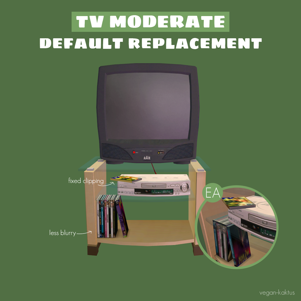 The file has been compressed to reduce file size and if you have any texture default replacement for the moderate tv you can use that one and mine, but it won't affect the dvds. If you have any mesh default replacement though, they are not compatible and you'll have to choose between that one or mine.