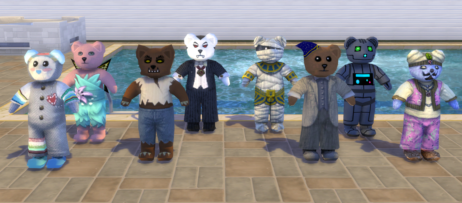 The small bears were based on Bleep the Robot and the big bears were based on Blarffy the stuffed bear, both of which are Base game objects, so there should be no issue with them in game. I actually had my Sim as seen above playing with the toys in game. Each bear has 3 different color schemes. Can recolor if you like, just please credit me!
