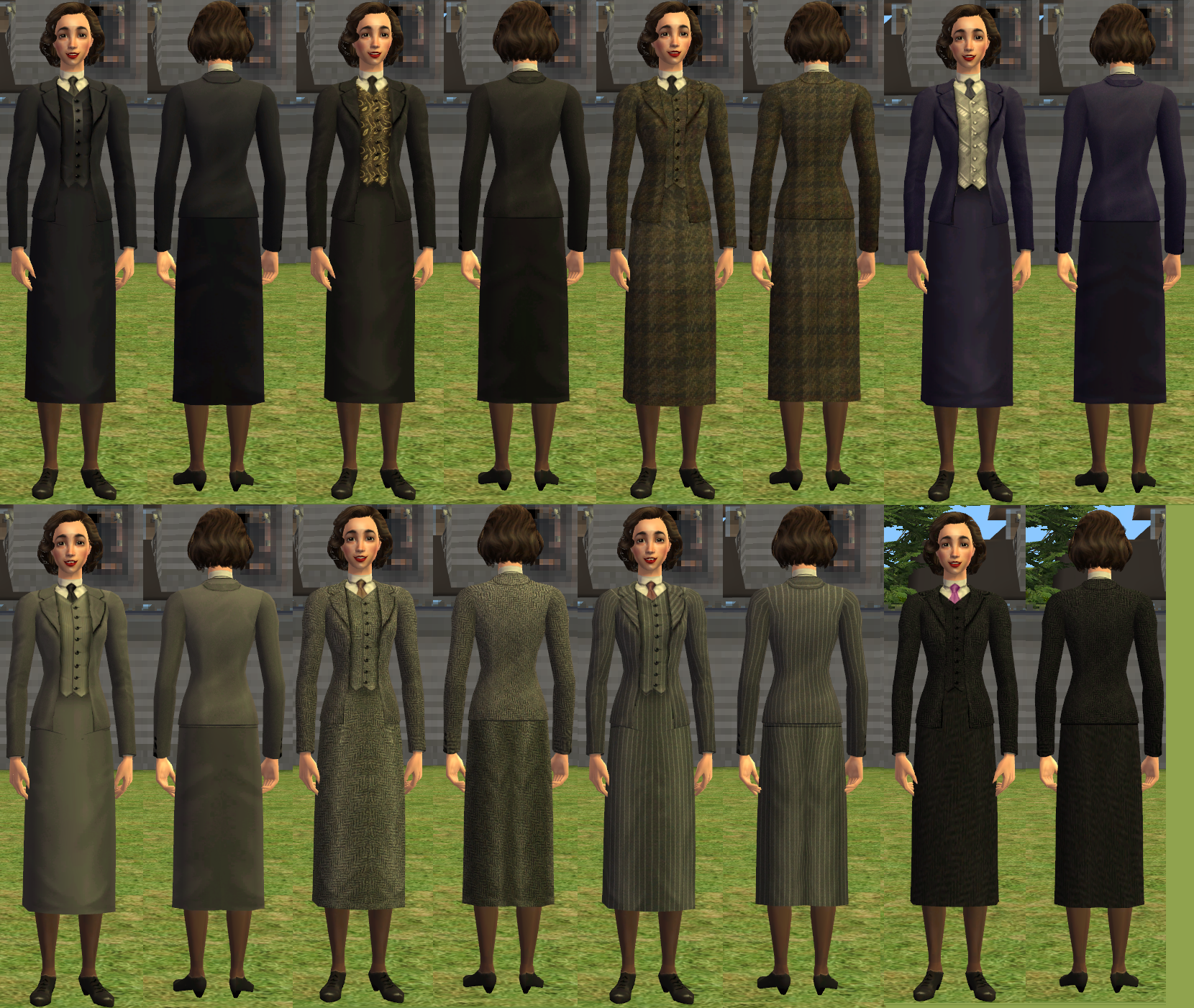 I present to you 23 skirt suits for adult and young adult women. They are good for your 1930-1940s households or teachers, professors, historians etc. or just formal clothes for modest sims. Most of them are just neutral or earth tone colours like black, gray, brown, beige...