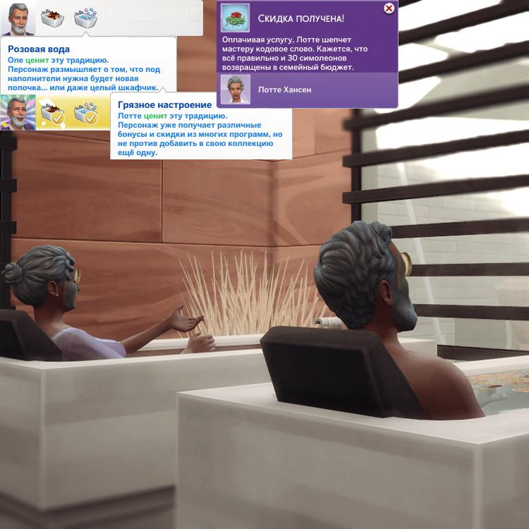 Чтобы выполнить традиции, персонажу нужно принять ванну с любым наполнителем для «Розовой воды» и грязевую — для «Грязного настроения». Сделать это можно и дома, но на участке типа «Спа» его ждут приятные скидки.