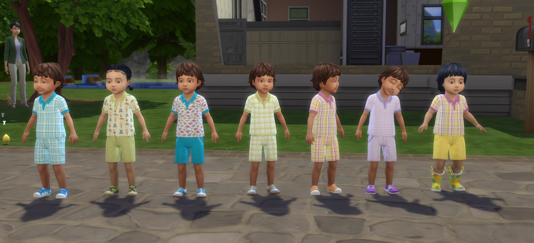 The Shorts are Base Game and the Polo Shirt requires Toddler Stuff.