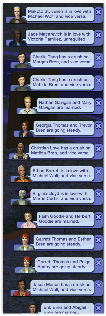 Fix Never Met Relationships will find all inappropriate relationship flags between living sims who do not know each other, and clear them. It will clear every relationship flag except for the family flag. The family flag is also unfortunately not guaranteed to be correct, but checking if the sims are actually family or not would make this process intractable. Anyway, this may also be spammy, but there will probably be many fewer incorrect flags than correct ones, so there should be fewer notifications. If you have a brand new hood, there may well be no incorrect flags at all yet. When this process is finished, there will be a notification that says "Finished".