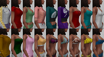 This is a collection of 18 Maxis clothing items in the 'Female-> Adult -> Top' Category. The outfits are a mix of Everyday, Athletic, Sleepwear, Swimwear etc.