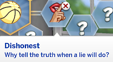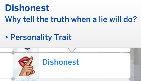 -3 different possible 'caught in lie' moodlets for both the Dishonest Sim and the Target Sim (varies based on Target Sim's traits)