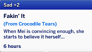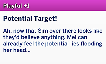 Must. Tell. LIES! (appears if the Sim hasn't lied in a while- any lie interaction will clear this) - Tense +2
