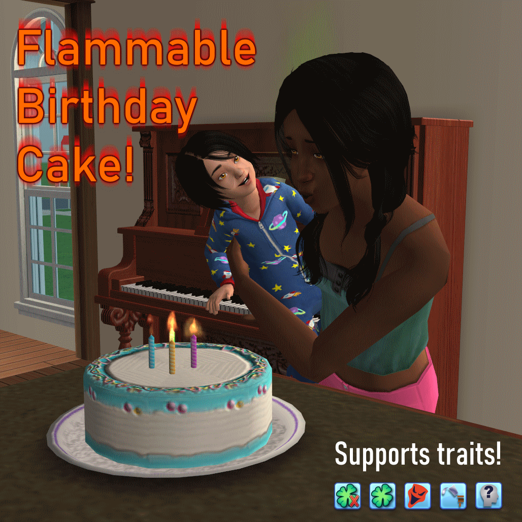 Add-ons for custom cakesSince the birthday sequence is assigned to each cake, not to the CakeGlobals as it would have made sense (blame EAxis), each birthday cake needs to be modified separately to include the chance of a fire. I have done this for a few birthday cakes that are widespread in the community, and a few that I personally use.