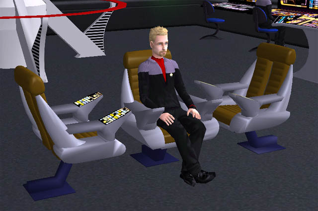 The base mesh was taken out of an Olympus-bridge mesh by someone called SeanR, found on www.trekmeshes.ch. I had to do massive remodeling to get down the polycount and make it suitable for Sims 2. It has 1650 polys and 1085 vertices but that's well within acceptable limits and you get a real 3D-padding - and not only a textured one.