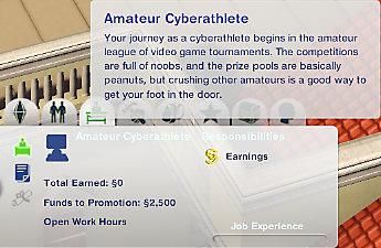 Teen and older sims with level 2 hidden Video Game skill or higher can compete in video game tournaments on the computer. There are five tiers of tournament, each costing more in entry fees and being harder to win, but offering larger cash prizes.