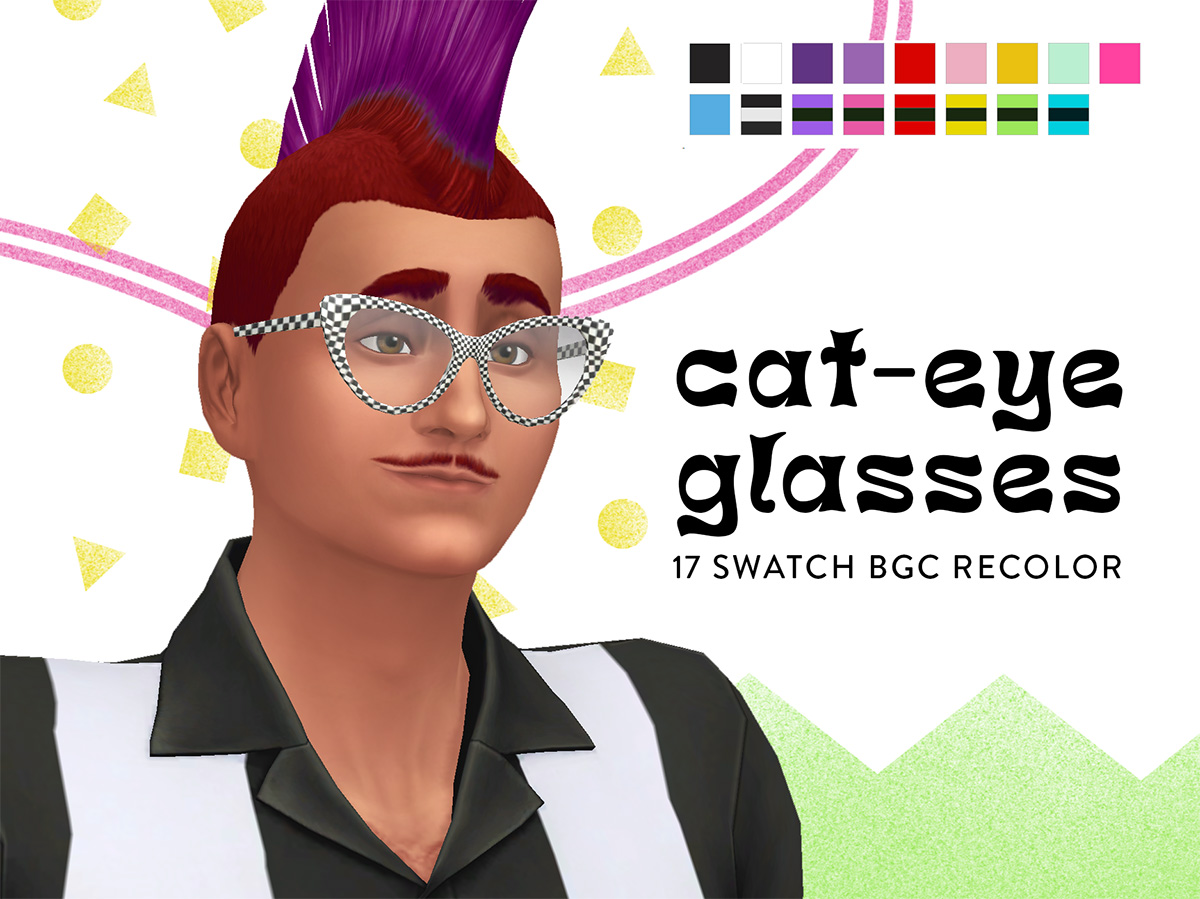 My focus has been absolutely abysmal lately and I haven't really gotten back to working on (let alone finishing) any of my cc wips, and real life things keep cropping up. I finally had some time to play TS4 last night and was updating a few sims and found myself in need of some more glasses options, so I made some recolors for a base game cat-eye frame. The swatches are mostly plain colors but I've also included some ska-ish swatches (skatches??) for some fun options for scene or rockabilly sims.
