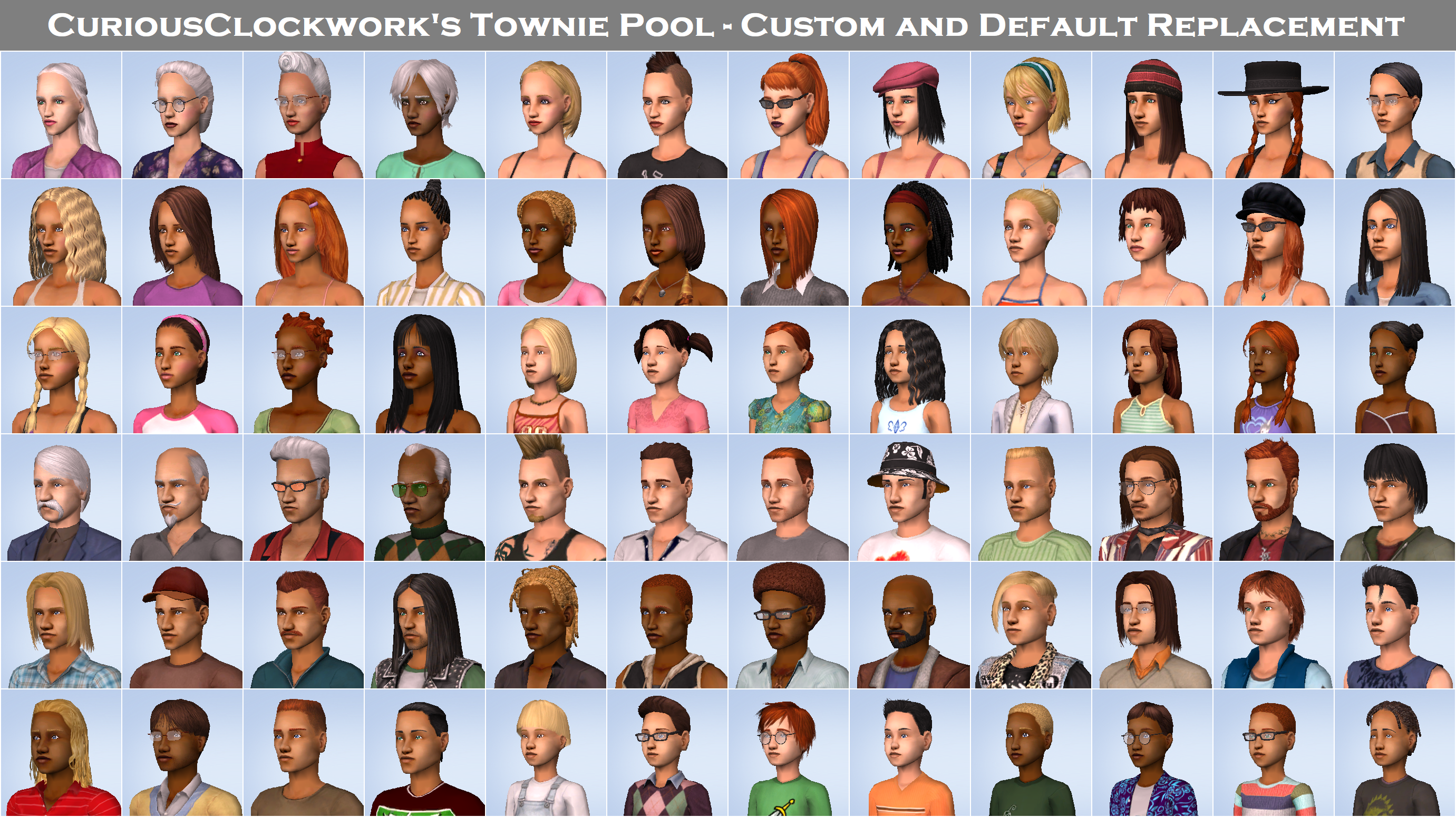 One the main reasons for wanting to make this entire thing was that I wanted townies that looked to my taste while also having as much genetic variety as possible. All age groups are included from elders to children. All skin tones, hair colors, and eye colors are included. The genetics are also paired in as much variations as possible. Sim A will have skin tone 1, hair color 1, and eye color 1, while sim B will have skin tone 1, hair color 2, and eye color 1. So on and so forth. They may not be the same sex or age, but the difference is there. It's not perfect, but I tried my best to make it that way.