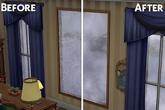 Five packages overriding seasonal effects/textures: Rain particles to have an actual texture to them instead of being sticks, less intense snowflakes, pond ice texture to finally be seamless and larger chunked to somewhat match off-lot water ice, and fall leaves that build up on lots to match off-lot leaves, redone window frost texture with more variation to it whilst keeping that painterly look.