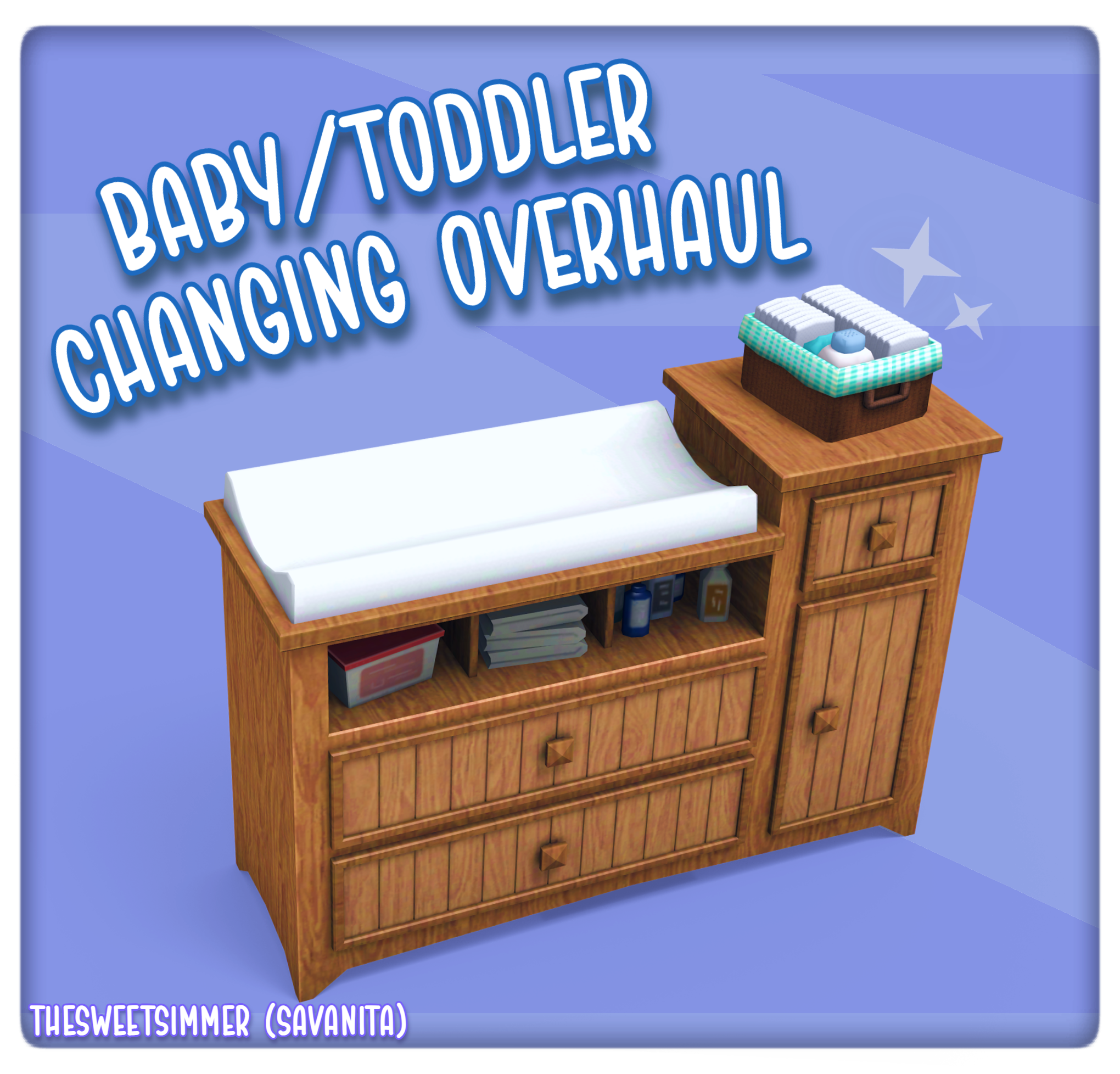 Store Changing Table Overhaul• Changing: If you put down a changing table on the lot, sims will change babies/toddlers there by default. If there is a diaper pack or basket with diapers slotted to the table, sims will automatically use a diaper from it, unless they have a diaper or diaper pack (that enables use at home) in their inventory, which they will prioritize using. Otherwise, they will search for a diaper around the lot. The changing animations have been swapped to quicker ones, and sims will now always powder babies/toddlers, although if their mood is low or they they have specific traits like Unlucky or Dislikes Children they will fail at powdering more often. A baby or toddler will have a higher chance of peeing while being changed if their bladder need is lower, and they will get a diaper rash moodlet from it.