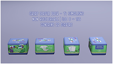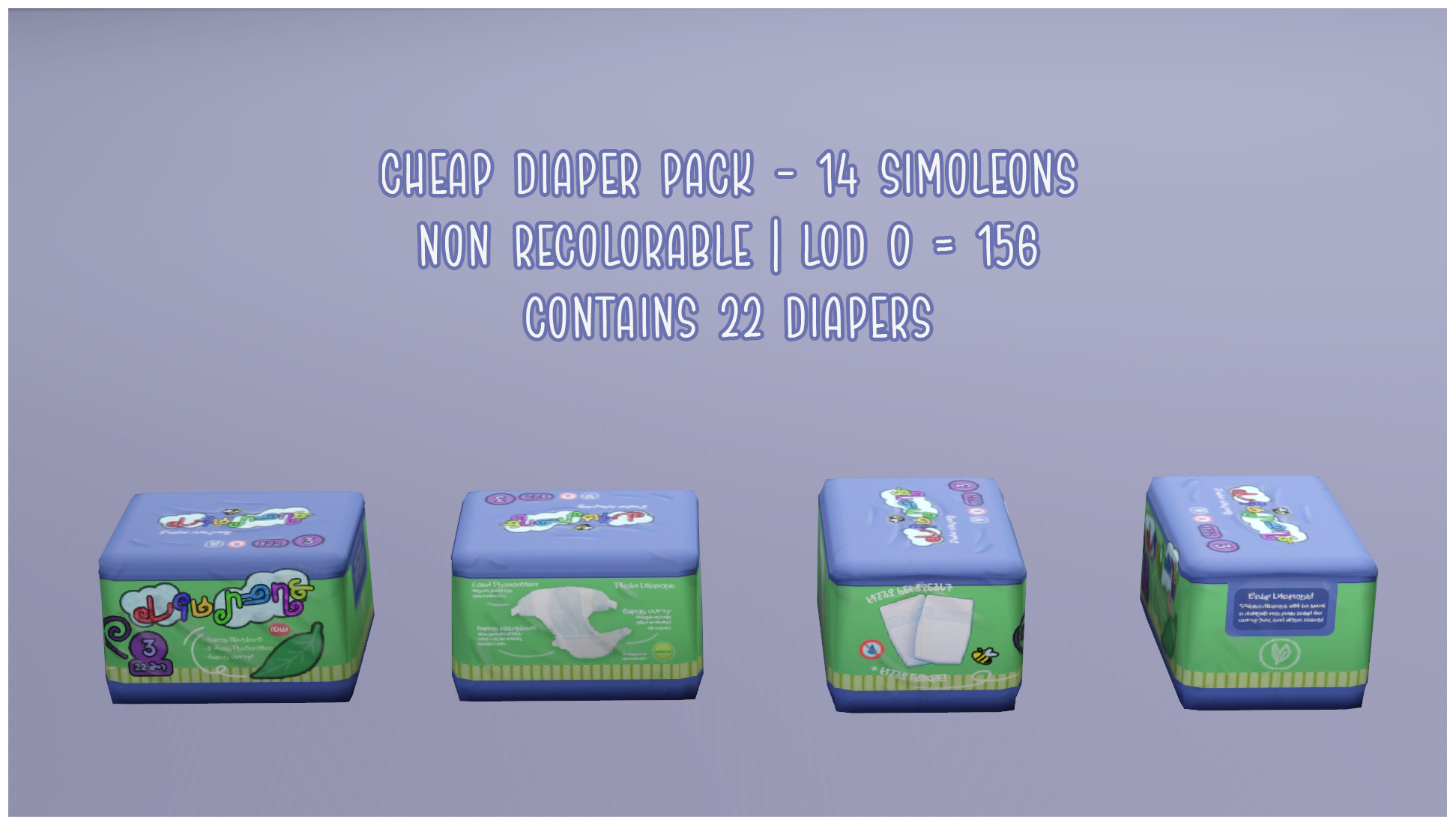 Summary: Sims will now need a diaper in order to change a baby or toddler. Diapers packs can be bought from the grocery store, you can get cheap ones that don't give a very good hygiene boost and have more chances of giving diaper rashes or you can get expensive ones that give a better hygiene score and have more diapers. If you have the store changing table, diaper changes will provide more hygiene when using it. This mod also fixes many issues that come with it.