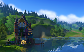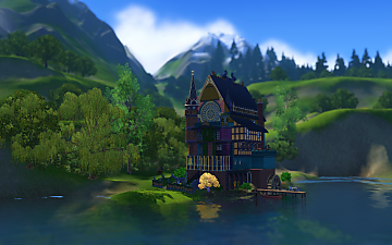 A great spellcaster lived here running an elixir/fortune telling/baubles business. The house includes two bedrooms and two bathrooms, a dining room, parlor, basement, kitchen, study, and sitting room. The attic is a space for an elixir garden and magic. Arcane cannons line the sides of the house for defence while travelling. Some wooden additions were made over time, improving the kitchen space and the firepower. A rustic yet refined house makes a stylish home whether in the wilderness or town square.