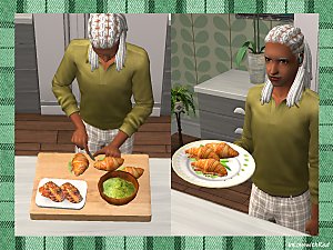 [10/26/25] It has been alerted to me that some are having issues with crashing after download. Currently working with others to fix and update the CC. There used to be a bakery in my hometown with the cutest desserts and little sandwiches and my favorite was always their croissant pesto chicken sandwich. When I saw this mesh, I knew I had to make it come to life in Simstown! I recolored jacky93Sim's 4t2 conversion of 'Croissants with salmon' by Somik_Severinka to bring you a filling sandwich with grilled chicken, pesto sauce, and mozzarella cheese, perfect for a lunch at a bakery or a quick meal.
