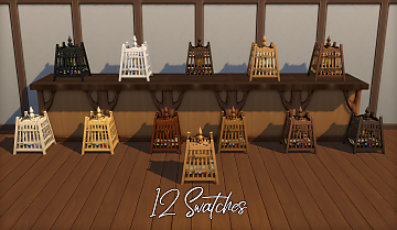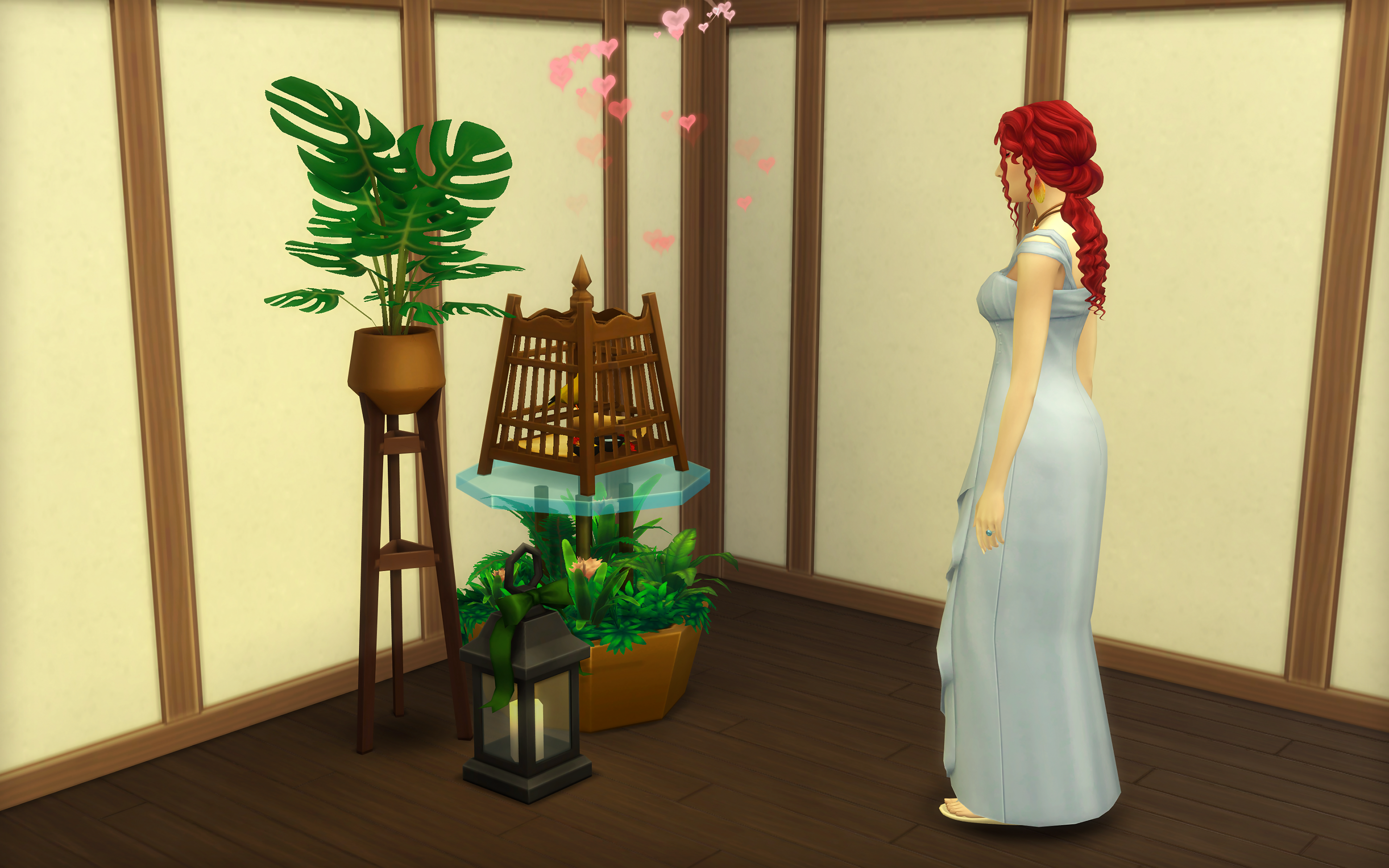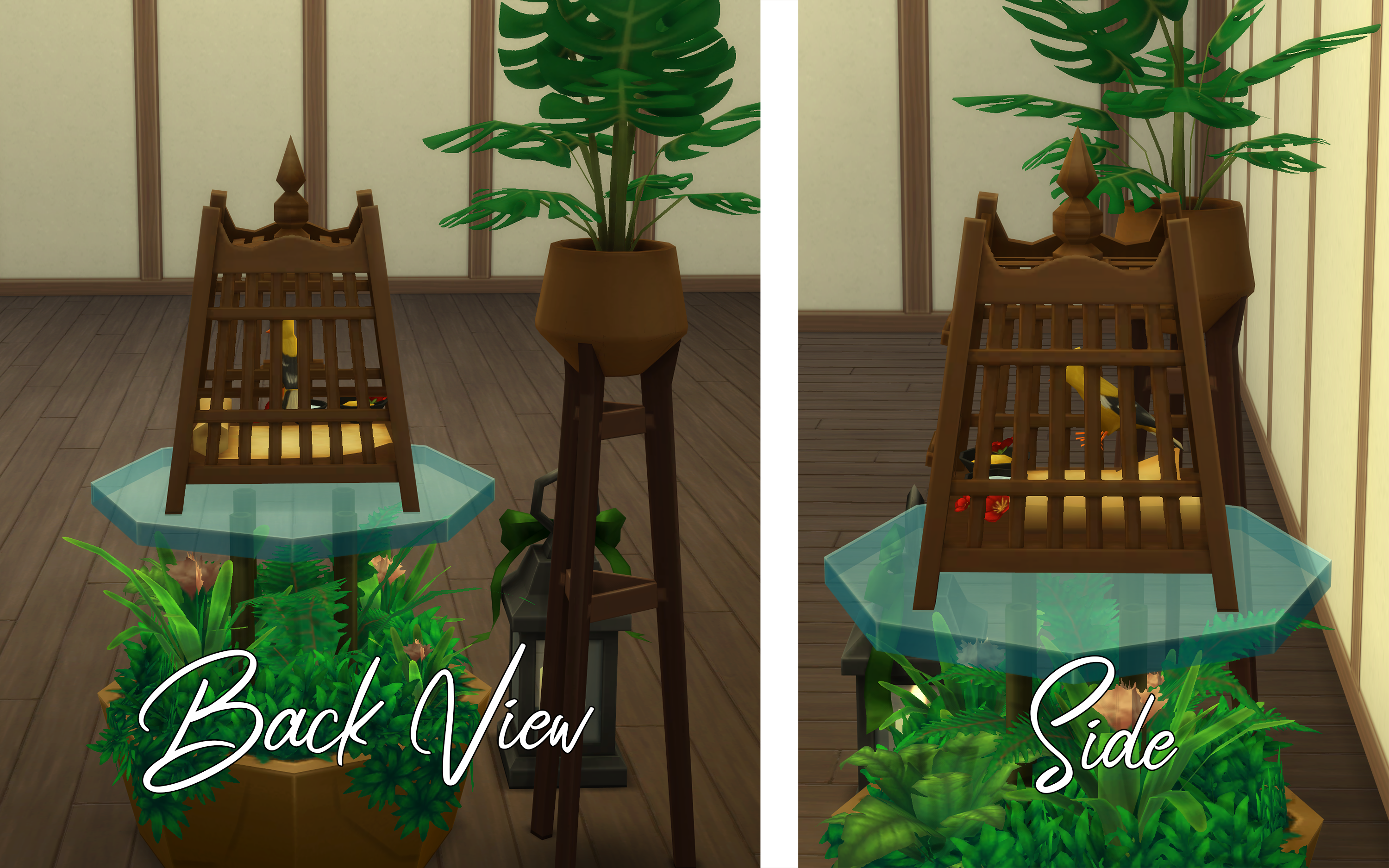 • This is not an animal object; it's a VFX generator. It borrows the looping Goldfinch effect from the Backyard Stuff bird-feeder. It's low res and janky - this is EA's fault, not mine. The Sims 4 can only load a limited number of VFX at a time, so the game comes with a built-in feature that stops 'extraneous' VFX from continuing to play. What this means functionally is that the Goldfinch will disappear if your active Sim strays too far from the cage (goes jogging, etc.). When that happens, click on it and select Put Bird Back in Cage. This will unglitchify it. (This could be a useful roleplaying feature, since the bird can presumably can let itself out whenever it wants, lol).