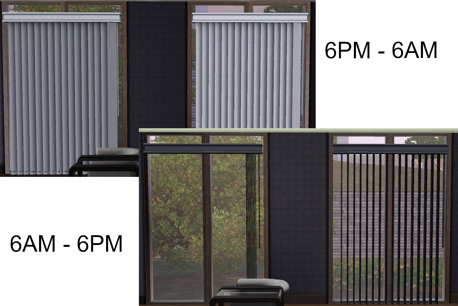 These blinds are the same as the Static Blinds from the base game - but they are not static anymore! During the day (6AM - 6PM), the blinds are automatically opened and are closed only at night (6PM - 6AM).
