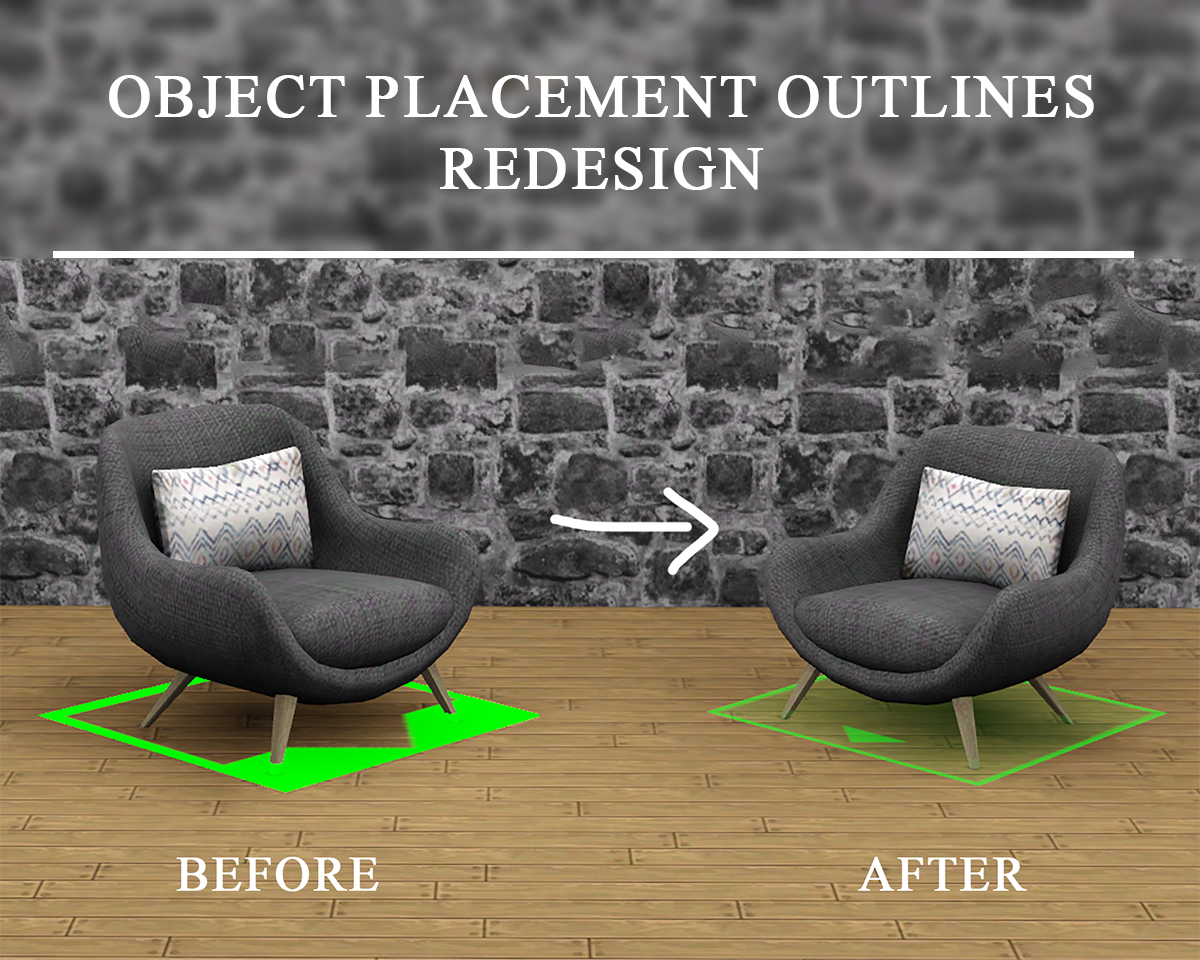 These object outlines have been redesigned to be similar to the placement outlines from The Sims 4. With reduced opacity and a cleaner style, they make building and decorating feel far less distracting.