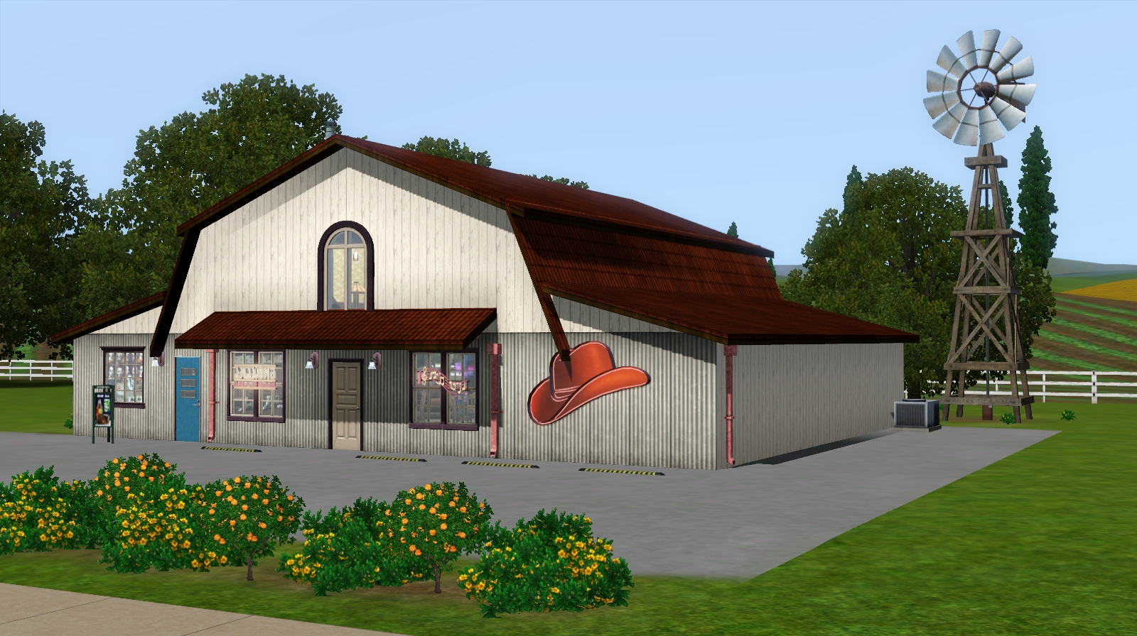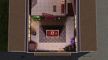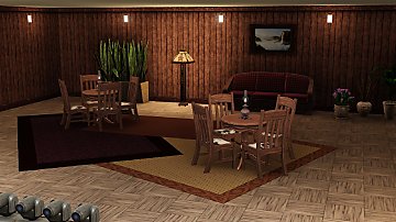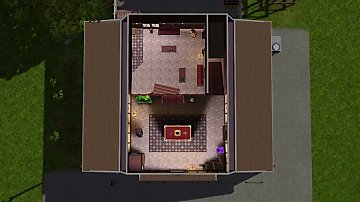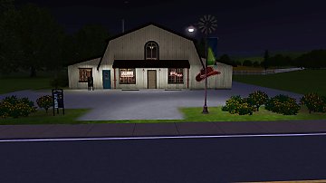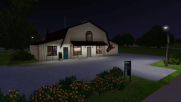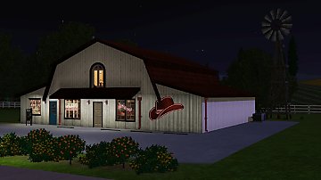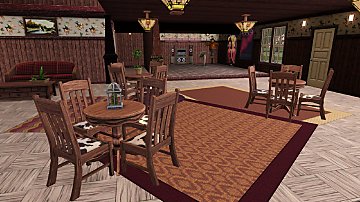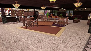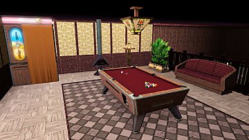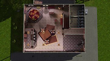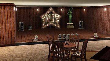 At the left of the first floor is the juice bar and the mechanical bull set up on a small stage. In the middle is the seating area, with both table seating and couches, and a small juke box tucked into the corner. On the right are both bathrooms and the karaoke stage. The second floor contains the loft with a pool table, a photo booth, and another couch. In the basement is the performance stage for the Showtime professions, and additional seating for an audience. Out the back is a fenced off area containing a dumpster, crates, and lumber that you can pretend is for the fireplace upstairs. Part of the roof does clip through the first floor (as shown in one of the interior images), but that is only a visual issue and should not affect gameplay.