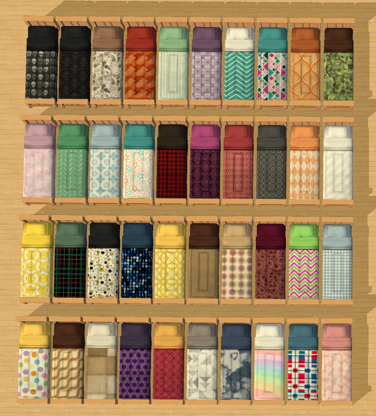 If you would like to have custom versions of the bedding or wish to supplement missing packs in order to have the complete set, download the file titled Bedding_Custom. Just a warning, the custom versions have the same name as the default versions so some of names are a little odd or misleading.