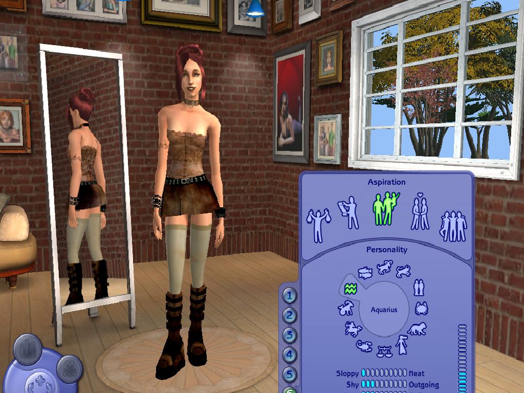 It's a brown leather miniskirt with a brown lace corset. Big brown boots, a collar, and tan thigh-highs complete the ensemble. It needs aarvarkams awesome GothGurlz mesh found here