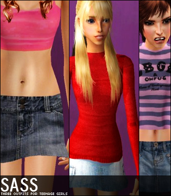 This is my first upload to MTS2, and I come bearing three stylish outfits for the teenage ladies. Note that ALL of these outfits REQUIRE ONLY ONE MESH. The mesh if from http://www.2-f0r-u.de and you must have the mesh called TEEN MINI HEELS. Please download that before downloading these.