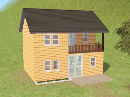 Two-story starter house (expanded version of #42/42a), furnished for 2-3 sims, with covered balcony. Open floorplan, some landscaping and decoration.