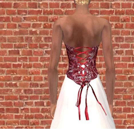 White formal gown with burgundy & silver bodice, although can be used as a nice alternate to plain old white & ivory, poofy meringues!