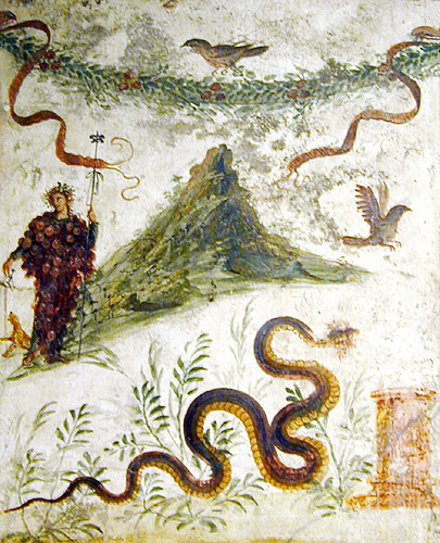 A mural wall from the ruins of Pompeii depicting the great god of all things enjoyable, Bacchus (Bacus, Bachus, etc.). He stands draped in vines and grapes while Vesuvius sleeps in the background. Underfoot is a snake, the Roman symbol of production, wealth, and virility. All in all, a good symbol.
