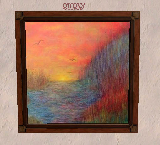 Here's the painting "Stormy" by Cindie Watkinson and one frame recolor (as pictured). You will find this painting in game under "Bella Squared"(BASE). I hope you like and enjoy.