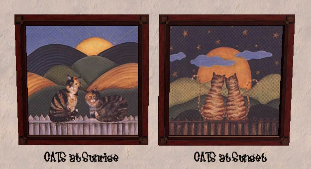 Here are 2 two cat paintings by Valorie Wenk and one frame recolor. Both paintings and frame recolor are in one .rar You will find these paintings in game under "Bella Squared"(BASE). I hope you like and enjoy.