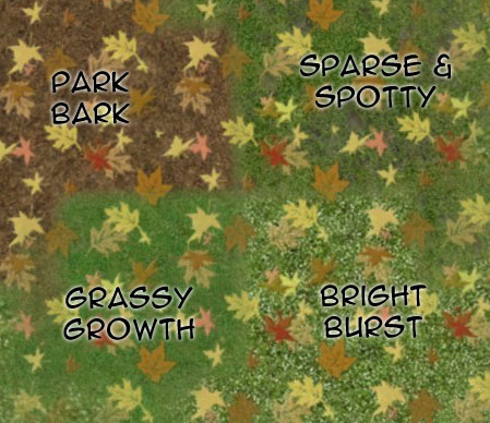"Grassy Growth", "Sparse and Spotty", "Bright Burst", and "Park Bark" with the added beauty of colored leaves. Enjoy!