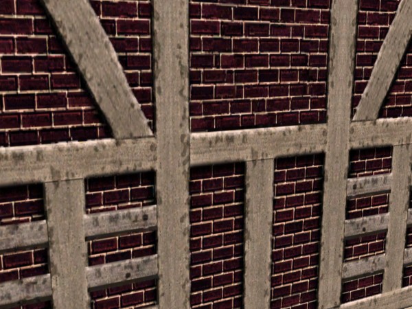Really old dark brick bordered in various patterns of wood bracing eaten by either worms or termites . Good for an old country home, factory setting or a warehouse apartment. Maybe good for a garage, basement or attic?