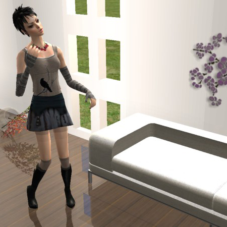 The mesh for the skirt is at www.2-f0r-u.de. Go to Meshes, then Fashion, it's on the 1st page, and it's "Loose Mini Heels". Much thanks to Evanesco for allowing me to recolour her great texture, link: http://www.thesimsresource.com/arti...ubtype82_Bottom