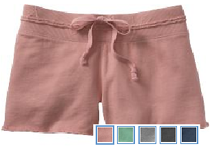 Cut-off-style fleece shorts have raw, frayed edges and a wide elasticized waistband with drawstring. Available in Tea Rose, Mineral Green, Heather Gray, Soft Black, and Blurred Blue.