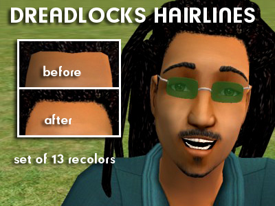 Many thanks to sirlemoncurd for the original idea and great work, and for giving me permission to do recolors and fix the alpha. And of course kudos to Compulsive D for her dreadlocks, and Simpathetic for hosting them.