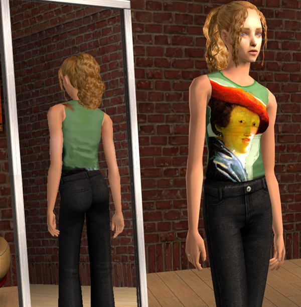 Hi, I'm Dominions and this is my first upload. I recoloured a Maxis shirt showcasing the art of one of my favourite artists, Jan Vermeer. I am new at the skinning aspect of the game and I hope I'll get better. I lightly modified the original hue and I played around the texture by painting and highlighting it. It was really fun to make and I hope you will have a lot of pleasure using it in your game.
