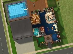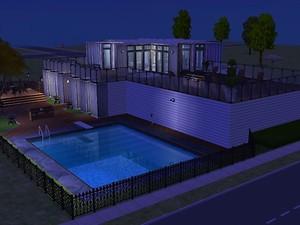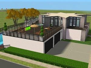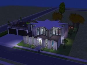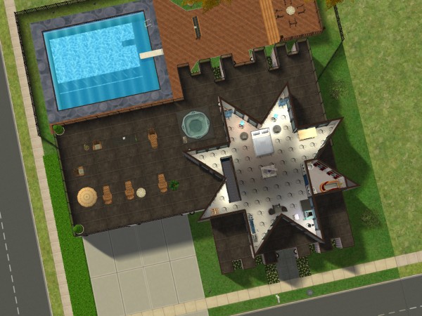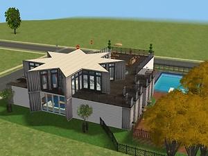 This is a funky modern party house with a two car garage and a pool. Its most striking feature is its master bedroom which is a large 8 pointed star. This is the perfect house for the sim who likes to throw parties.