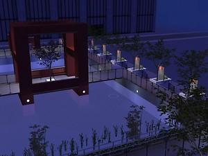 A man-made lake surrounded by a tree-lined boardwalk is centered around the focus of the piece - a large decorative sculpture. The lot looks good both in the day and in the night.