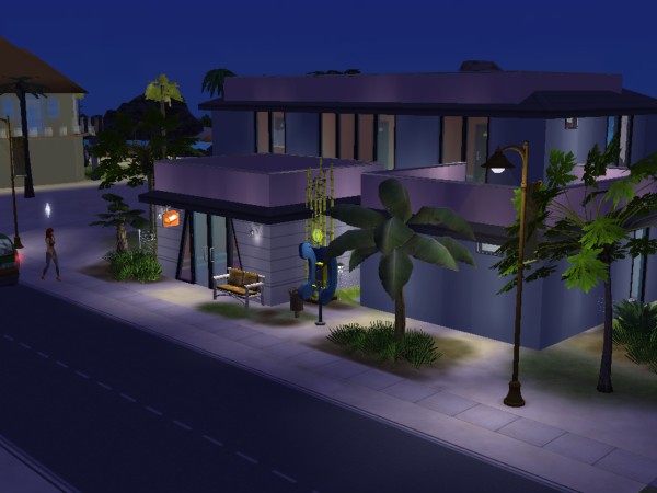 Luxury hotel with 4 simoleon rating, 5 rooms, fire dancer for entertainment, coffee bar and social area (to learn the hula) and shopping.