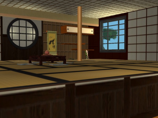 While this tea house is not exactly traditional, I have tried to keep as many of the traditions I could in a Sims context. There are some subtle Shinto aspects as well (the Maxis-provided V's on top are reminiscent of Ise Shrine . The main house is the tea house and the smaller house is the unisex restroom. There is a lake, a small shrine and a garden to rake. There is also a second story on the tea house, which is empty so I did not provide an image for it. There is accidentally a dresser inside the tea room, please change this to a dressing room so you can have your sims change into their kimonos before they start the tea ceremony. I used the BV tea table because it allows sims to sit on cushions on the floor, though it is not accurately the way the tea ceremony would be performed in the taoist/zen Buddhist tradition.