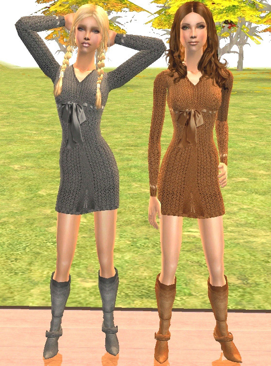 Two knitted dresses for beloved ladies. Will show in Everyday category. It was made from Dori’s mesh at http://www.2-f0r-u.de/ and will work on all versions of the game. From Russia with love :0)