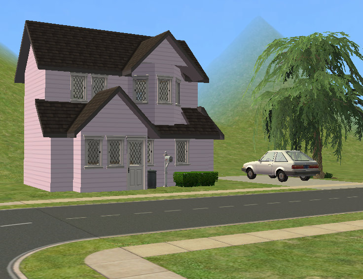 This is the 'purple' house on Rainbow Street. It is a lovely house furnished for 1-2 sims. Perfect for a young couple. There is a driveway witha car out the front.