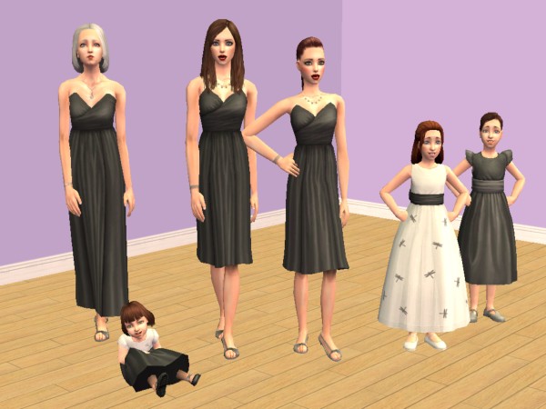 Heya, today I bring Celebration Stuff recolours! I've recoloured the ruched bridesmaid dresses for teens, adults and elders, two of the child bridesmaid dresses, and one for toddlers. They're in black; because Goths get married too!