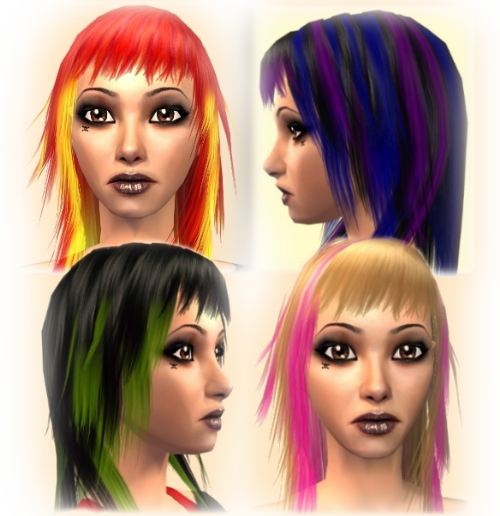 I made 6 recolors of xmhair 61 Red and Yellow, Black purple and blue, Black and green, Black and blue, Blond and green, Blond and pink.