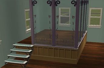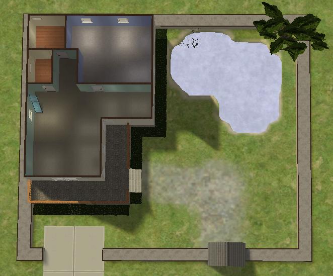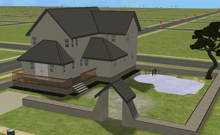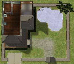 This lot has 2 bathrooms, 2 bedrooms, a large living room and a large kitchen/dining area. Also, there is a raised area on the 2nd Floor that can be used for keeping your sim's toddlers out of trouble. A garden with a pond gives those of you with Seasons somewhere to fish and the family to run around in. There is a driveway included, so this requires Nightlife.
