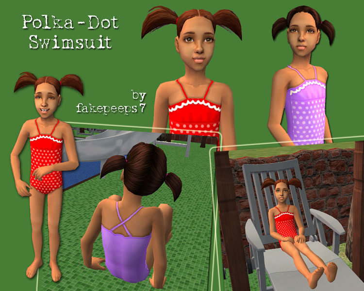 This swimsuit for little girl Sims is based on a Maxis mesh, so no EP is needed. I made this suit in turquoise a while back and had it on the Exchange. It was one of my favourites, and I wanted to have a few more colours. So here they are! Both feature subtle polka-dots on the front panel, white scalloped edging, and straps that cross in the back.
