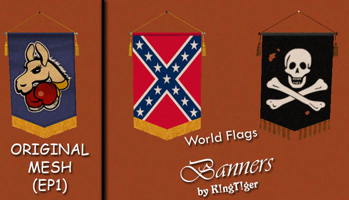 This is a great selection of banners, from Europe to America. Now, your sims can decorate theirs home, with these banners. The flags use the Llama banner (down) of TS2 University! This is especially good for bedrooms, livingrooms or kitchens. This is the list of the flags: